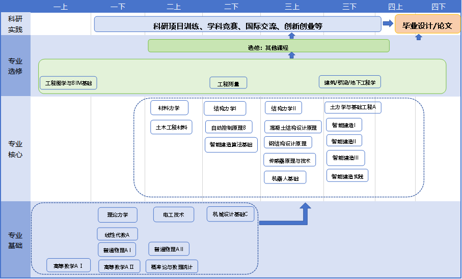 2. 学科知识:具备扎实的数学及自然科学基础知识,掌握宽厚的智能建造及相关领域的专业知识,具备适应土木工程智能发展的相关基础知识储备。