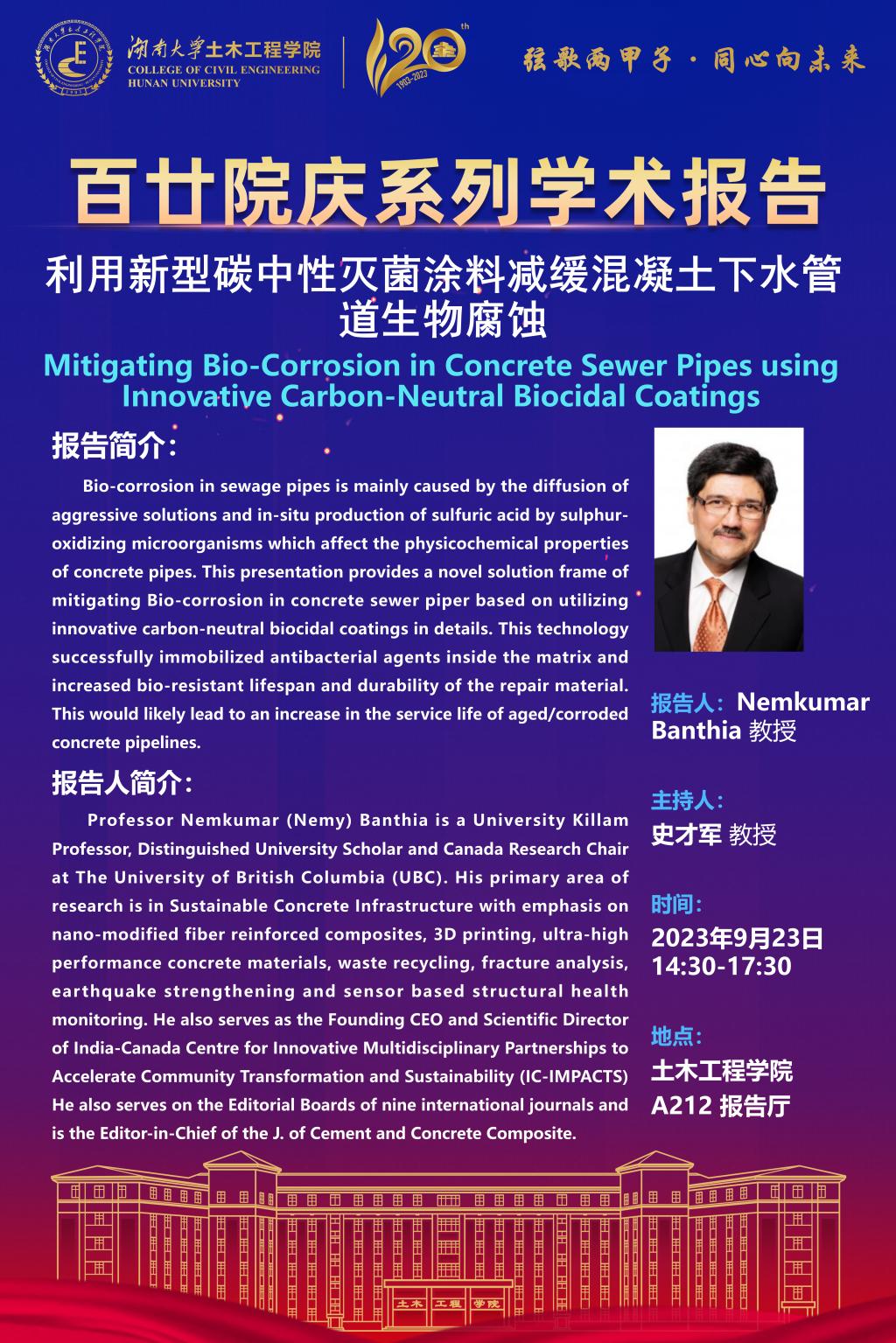 百廿院庆 学术活动|Nemkumar Banthia:Mitigating Bio-Corrosion in Concrete Sewer Pipes using Innovative Carbon-Neutral Biocidal Coatings