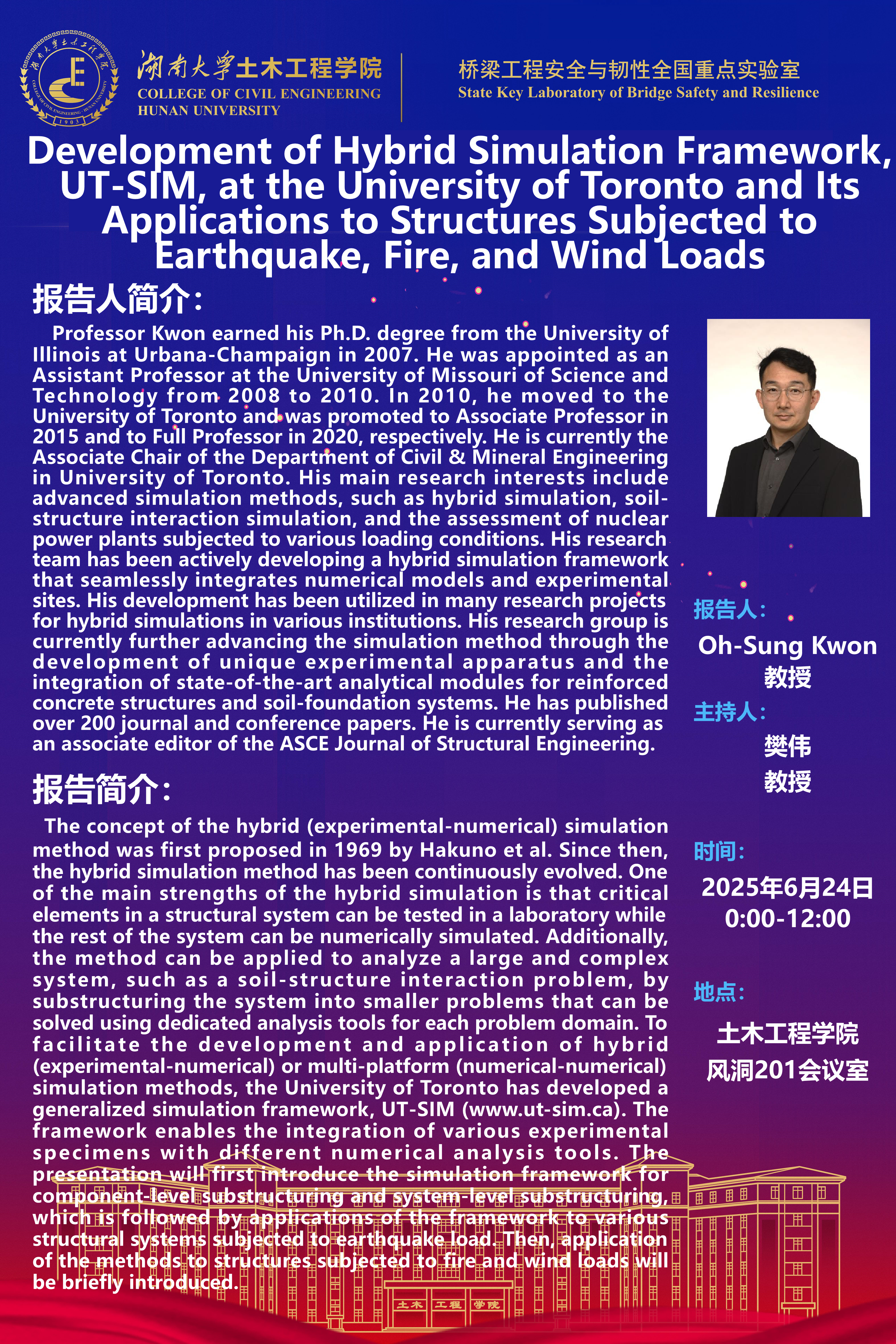 Oh-Sung Kwon:Development of Hybrid Simulation Framework, UT-SIM, at the University of Toronto and Its Applications to Structures Subjected to Earthquake, Fire, and Wind Loads
