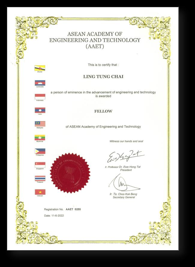 日前,东盟工程与技术科学院(ASEAN Academy of Engineering and Technology, AAET)向我院LING TUNG CHAI(林忠财)教授授予Fellow荣誉称号。