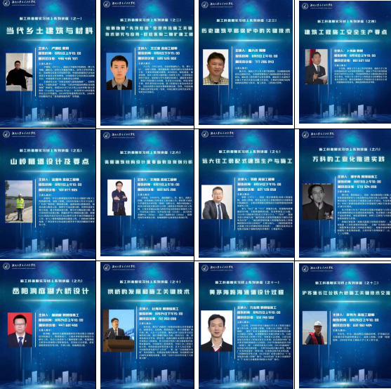 建筑工程系邀请了卢健松教授、王海霖高工、张胜高工、谭宇昂教授级高工分别开展了关于乡土建筑材料使用、高层复杂结构设计、远大装配式结构生产施工和万科工业化推进实践等多方面的主题分享;建筑管理与防灾工程系邀请了我院陈大川教授、卜良桃教授分别开展了关于建筑平移、施工安全两个主题的分享;岩土工程系邀请了王江营高级工程师、金建伟高级工程师进行全逆作法关键技术和山岭隧道设计关键技术的应用等方面的介绍;桥梁工程系邀请了崔剑峰教授级高工、杜海龙教授级高工、万志勇教授级高工、李有为高工4位校友介绍国内多座具有重要影响力的大型桥梁工程设计、建造和创新实践。