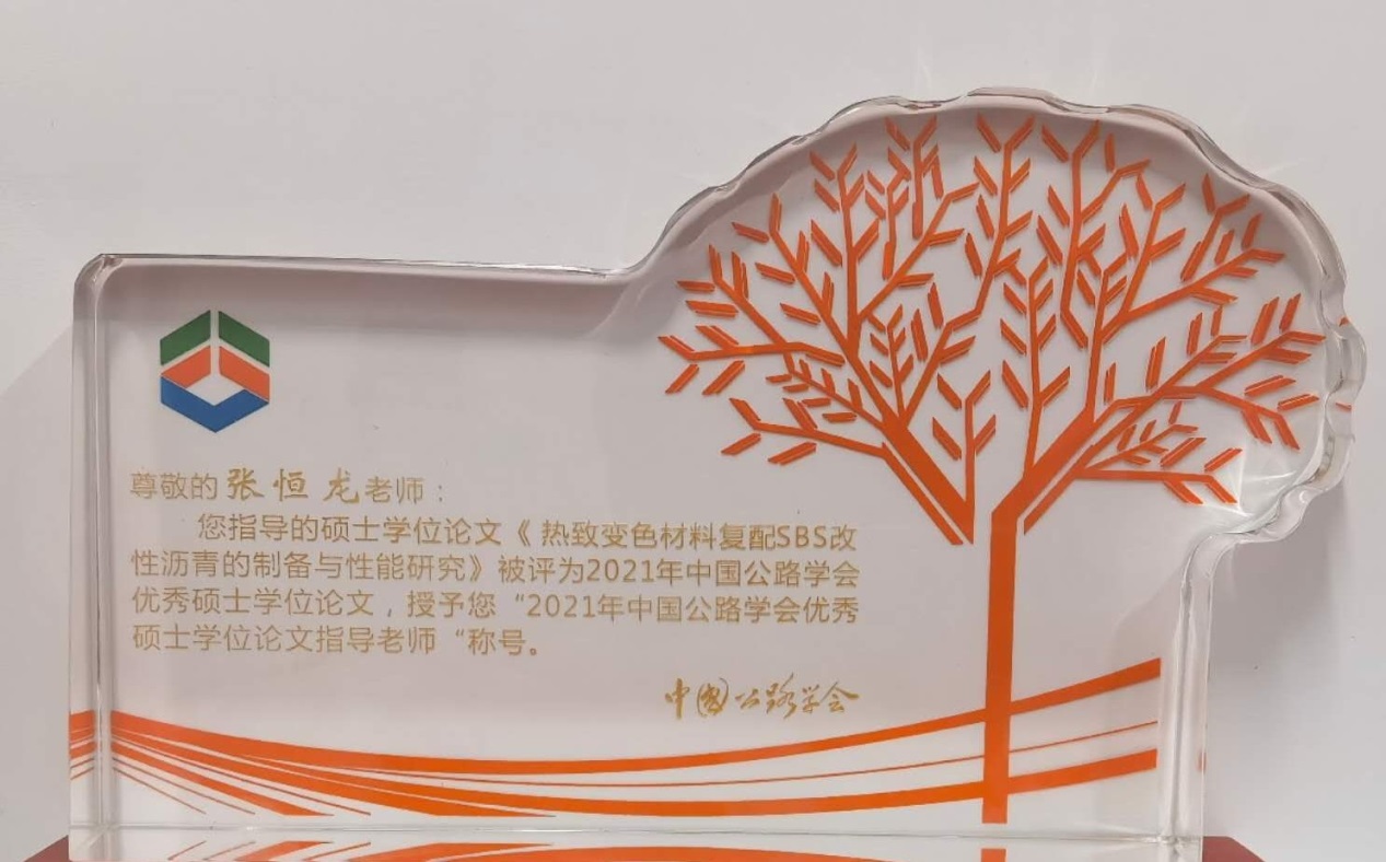 为了贯彻落实国家科技强国、人才强国战略,推动公路交通学科的建设和发展,加强高层次创新性人才的培养工作,2021年中国公路学会开展了首届优秀博士、硕士学位论文的评选工作。我院2019届毕业生李璐的学位论文《热致变色材料复配SBS改性沥青的制备与性能研究》,荣获2021年度中国公路学会优秀硕士论文奖,其导师张恒龙副教授获得“中国公路学会优秀硕士论文指导教师”称号。本次共有来自同济大学、东南大学、哈尔滨工业大学等高校的102篇硕士论文参与评选,最终20篇硕士学位论文入选,并在2021年6月15日召开的世界交通运输工程技术论坛(WTC2021)上举行了颁奖典礼。