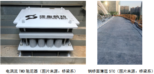 大桥设计单位总结了海心桥的十大创新,其中两项采用了我院教师的科研成果:大桥采用了由陈政清院士团队研发的电涡流TMD阻尼器(总重25.6吨),以满足节假日高峰期行人通行的舒适性要求;采用了由邵旭东教授团队研发的薄层超高韧性混凝土(STC)轻型组合桥面结构(STC层厚仅2.5cm),增强了薄层铺装与主结构协调变形与防裂性,并提高钢梁的耐久性。