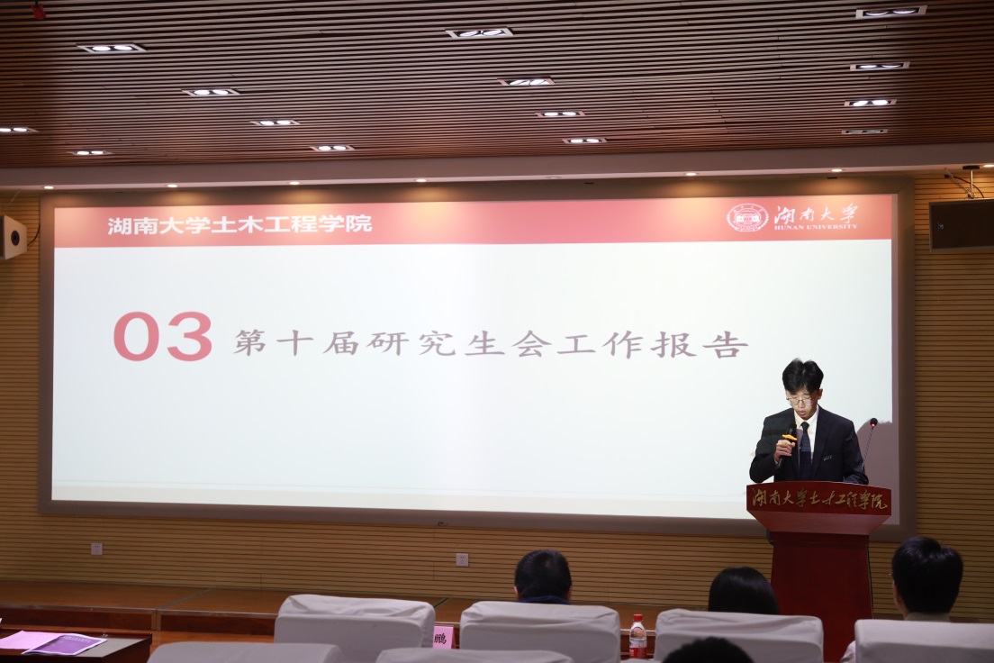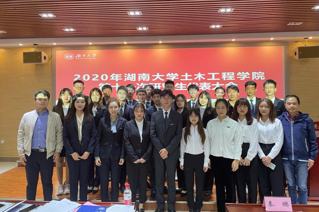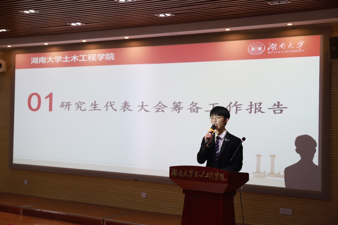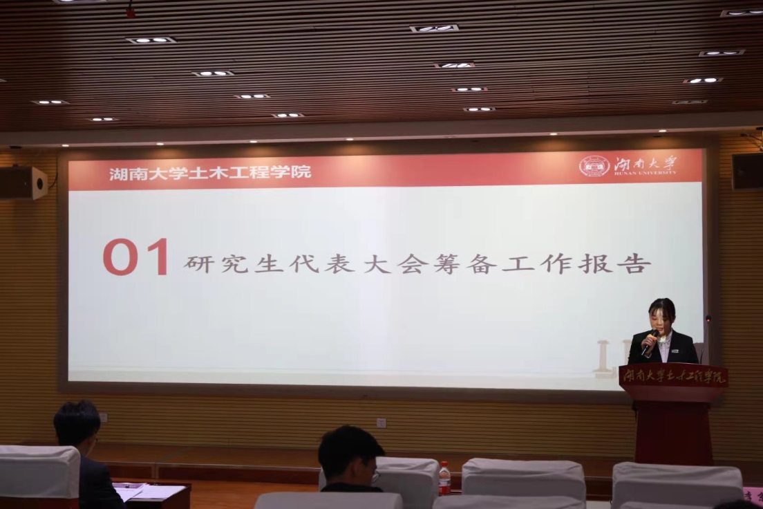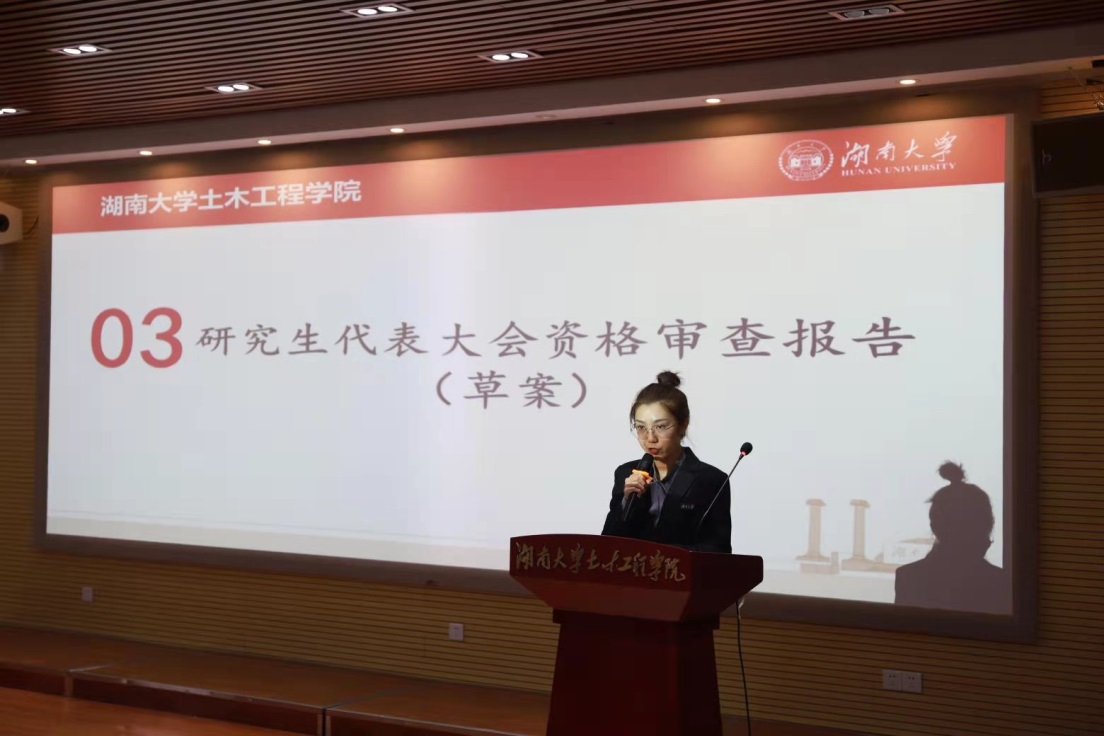 党委副书记秦鹏老师、院学工办主任向杰老师、院团委书记田文婷老师、研究生辅导员李京松老师、研究生辅导员吴柯娆老师出席会议。来自全院的42名研究生代表到会听取并审议了院研究生会工作报告,并选举产生新一届土木院研究生会执行委员会。
