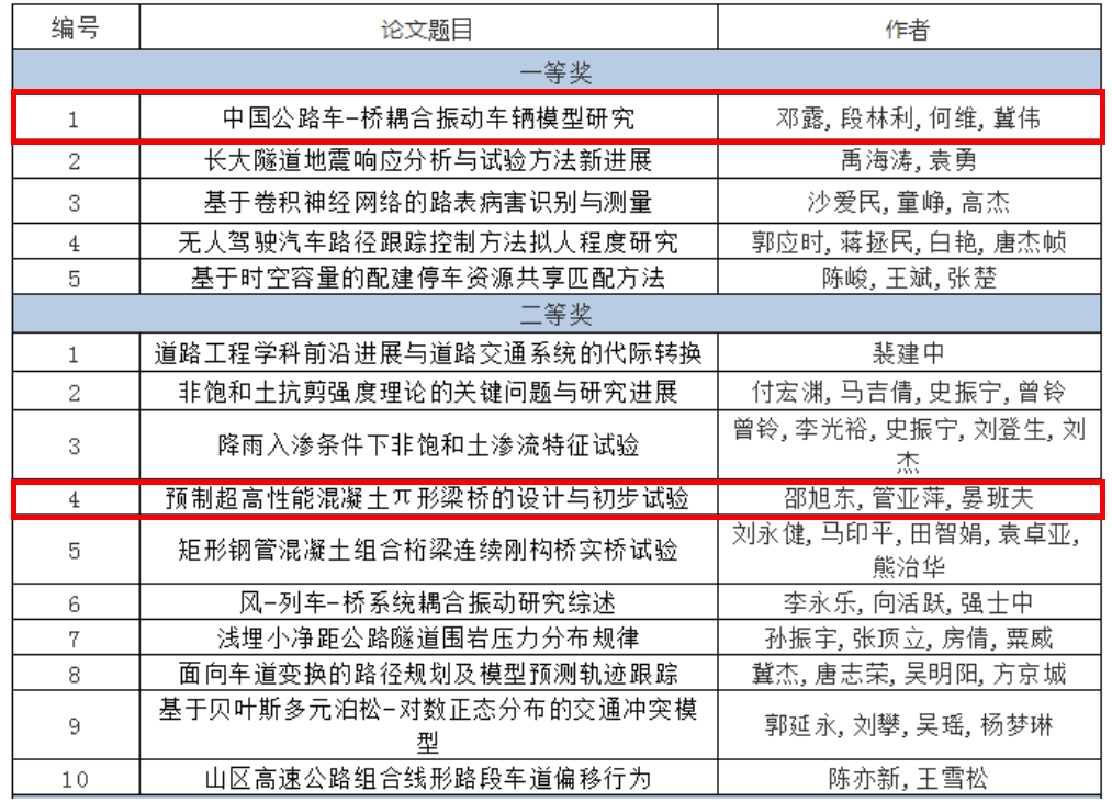 日前,2020年度《中国公路学报》优秀论文评选结果公布。经初步筛选、微信平台投票、评审委员会专家遴选和网络公示四个环节,共评选出25篇优秀论文。我院邓露教授团队发表的《中国公路车-桥耦合振动车辆模型研究》论文荣获一等奖,邵旭东教授团队发表的《预制超高性能混凝土π形梁桥的设计与初步试验》论文荣获二等奖。以上获奖成绩表明我院在桥梁、交通领域多年来持续产出的高质量研究成果在学术界和工程界赢得了广泛的学术影响力和声誉。