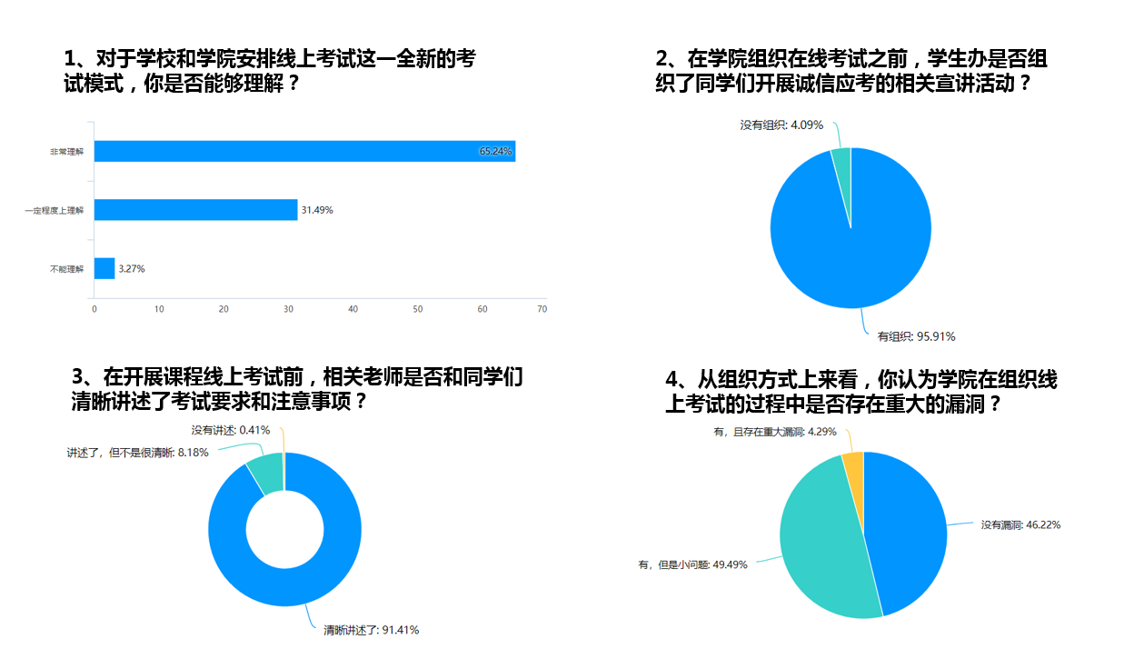 所有参与线上考试考生,问卷涉及到489人参与率达98.9 %。以“学生中心,成果导向,持续改进”的认证要求,对学生的观点和情绪有针对性地进行了解,并为未来可能出现的复杂局面做好了持续改进的准备。从调查结果来看,学生表示普遍理解和支持线上考试,对考试前各方面的组织工作表示认可,对考前老师的工作表示满意,并对今后类似工作开展提出了合理化建议。