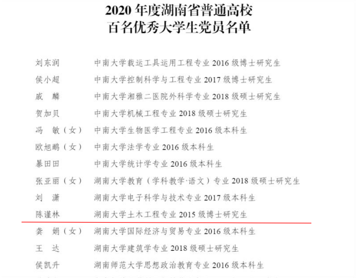 建党99周年之际,根据湖南省委教育工委《关于评选表彰2020年度普通高校百佳大学生党员的通知》相关要求,经各高校评选推荐,省委教育工委、省教育厅认定我院2015级博士研究生陈谨林为“湖南省优秀大学生党员”(全校获评五位)。