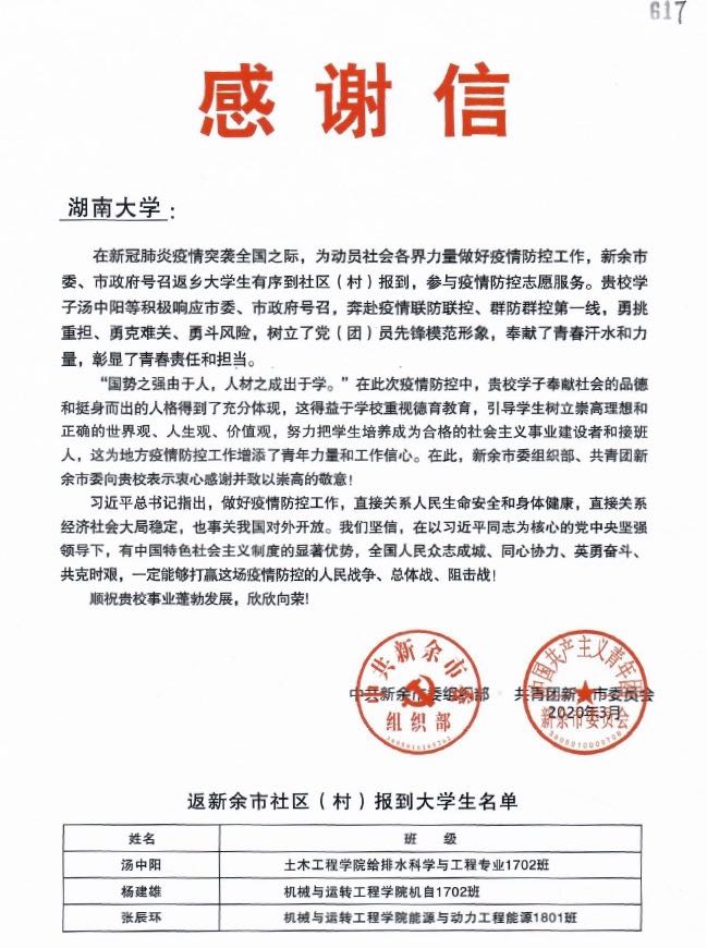 近日,我院收到一封来自中共新余市委组织部、共青团新余市委的感谢信,对我院2017级给排水科学与工程专业1702班汤中阳同学积极参与当地疫情防控志愿服务、彰显青年责任担当表示感谢。