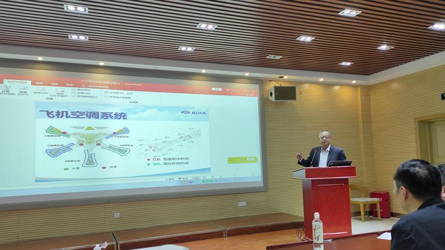 首先,龚光彩教授致欢迎辞,诚挚欢迎徐伟高级工程师的到来,并希望大家能够借此机会多多交流。接着由徐伟高级工程师进行学术报告会。徐伟高工就大兴新机场的能源方案中的暖通空调创新技术做了详细介绍,该项目结合实际情况就近设置制冷站,最大限度的减少了冷媒输送距离,有效降低了运行成本。该项目运用了多种节能措施,比如烟气余热利用,烟气冷凝水回收等,并采用新型地源热泵+冰蓄冷联合供冷的方式作为冷热源方案,使空调系统的运行达到了高效节能的效果,充分体现了绿色经济的设计理念。该报告的相关成果对区域能源、城市能源系统优化有很好的借鉴。同时,徐伟高工还提到,该项目使用的设备,国内品牌占有率达到95%以上,我们可以从中体会到中国制造已经被赋予了新时代的定义,正如习近平总书记所说:“北京大兴国际机场是国家发展一个新的动力源”。