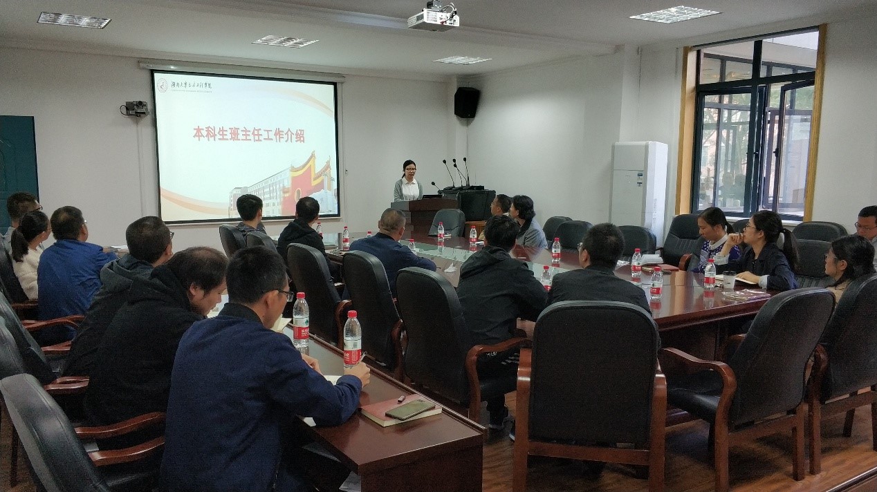 辅导员田文婷从班主任的岗位性质、工作职责和工作考核三个方面介绍了班主任工作的基本内容,并从2019级本科生招生情况、2018级本科生上一学年的成绩分析情况入手强调了班主任老师在班级学风建设、专业认同教育和生涯规划指导上的重要作用。