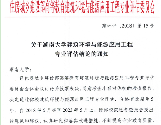 2018年6月8日,住房和城乡建设部高等教育建筑环境与能源应用工程专业评估委员会印发了《关于湖南大学建筑环境与能源应用工程专业评估结论的通知》(建环评(2018)第15号),通过了我院建筑环境与能源应用工程专业评估,有效期为5年。