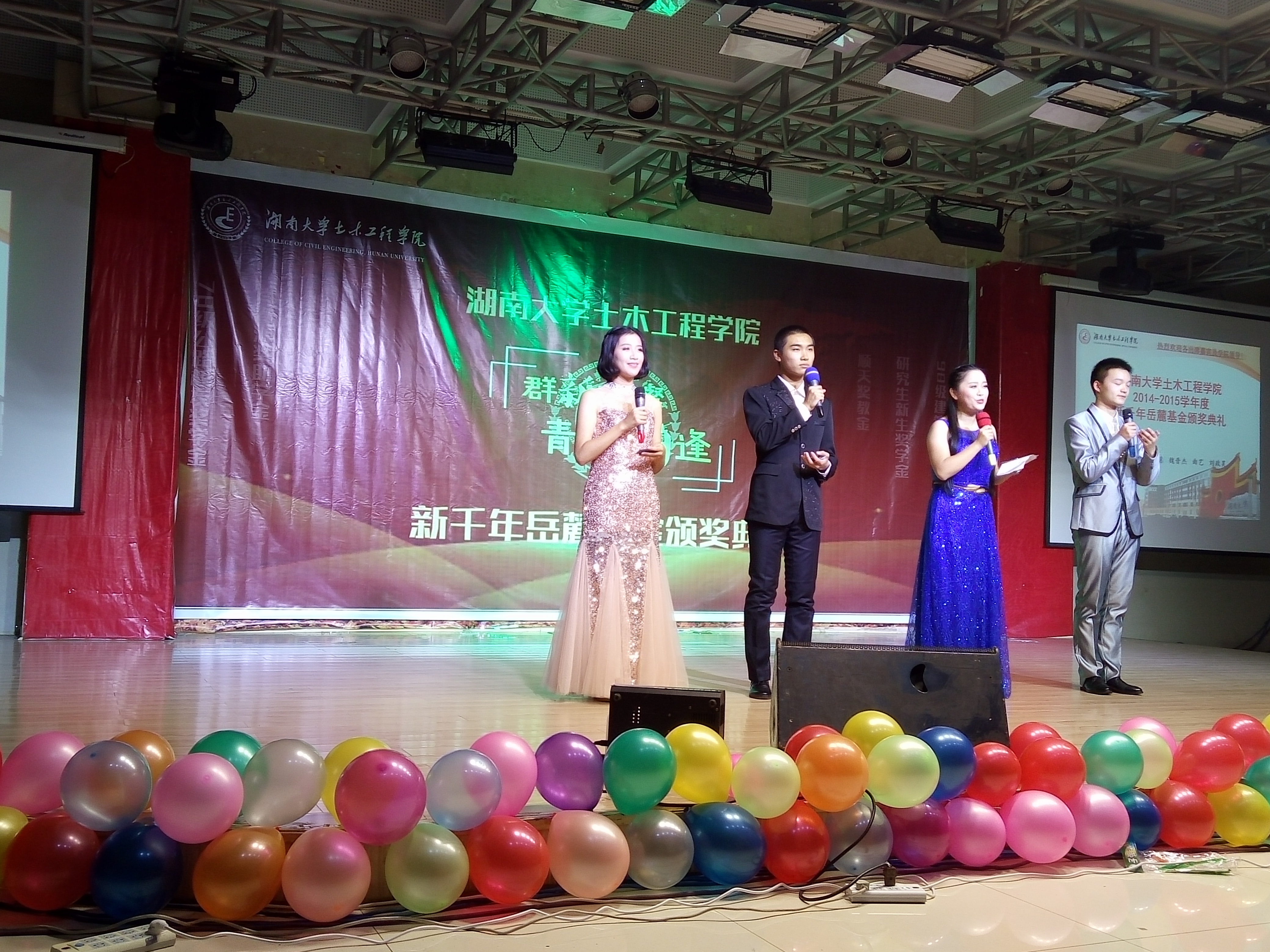 12月20日19:00, 羞羞漫画 举办了以“群星璀璨,青春湘逢”为主题的2014-2015学年度新千年岳麓基金颁奖典礼在校工会活动中心举行。出席此次颁奖典礼的嘉宾有肖春源奖助金设奖代表长沙鹿回头集团技术总监余开华先生,78级公路专业校友奖学金设奖代表李嘉女士,98级建筑工程专业校友奖助学金设奖代表周云先生, 羞羞漫画 院长陈仁朋,土木院副院长施周,土木院党委副书记颜李,土木院党办主任李峥,土木院学生办主任向杰,土木院班主任老师代表黎莉、余嘉勇、周芬和全体辅导员,200余名同学也以极高的热情参与了此次颁奖典礼。