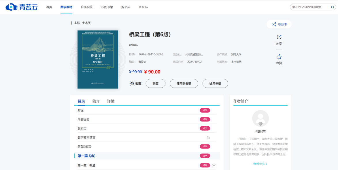 2024年10月2日,我院邵旭东教授等主编的《桥梁工程(第6版)》数字教材在“青蓝云”数字教材平台正式发布。教材由人民交通出版社出版,上海同豪土木工程咨询有限公司参与制作。