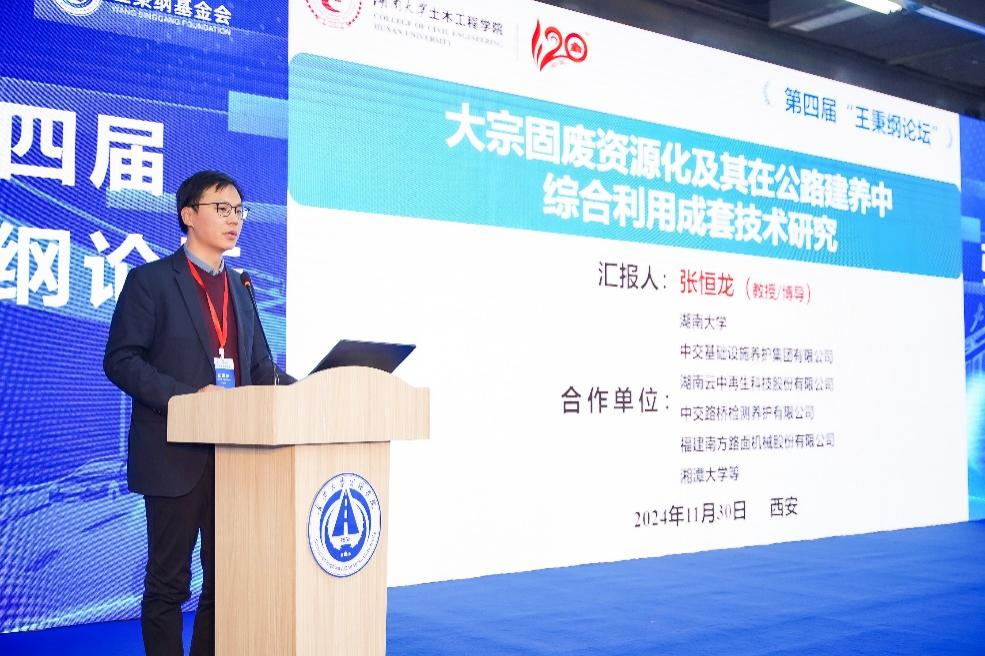 会上,张恒龙受邀作题为《大宗固废资源化及其在公路建养中综合利用成套技术研究》的学术报告,系统介绍了项目团队关于建筑固废和道路固废等大宗固废在道路结构中绿色低碳协同利用的成套技术体系,并结合川藏公路G318线提质改造工程和沪昆高速潭邵段大修改造工程等典型工程,介绍了研究成果在全国多省市规模化应用情况。