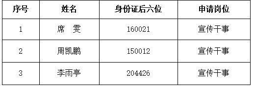 根据我院劳务派遣岗位招聘工作安排,经招聘工作领导小组研究,择优确定以下3人进入宣传干事后续考察环节,名单如下。